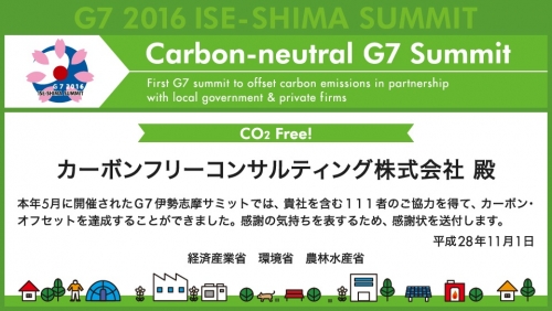 G7伊勢志摩サミットのカーボン・オフセット協力の感謝状が届きました!(2016/11/11)