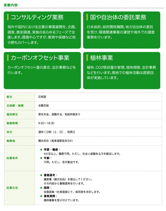業務内容:主として環境経営コンサルティング業務が中心ですが、ご希望と適性を鑑み海外事業への参画も可能です。