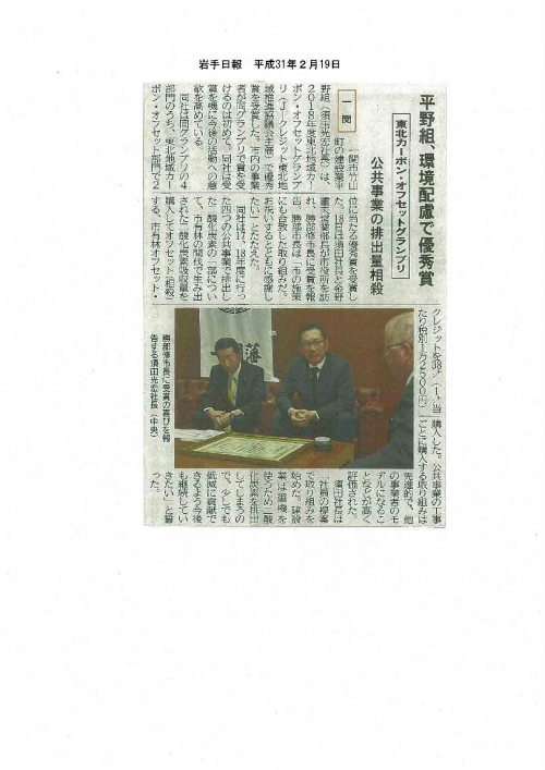 第4回東北地域カーボンオフセットグランプリ優秀賞の岩手県一関市の平野組の取組が掲載されました。(岩手日報,岩手日日新聞2019/2/20)