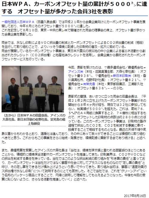 一般社団法人日本WPA様は総オフセット実績5000トンを達成され、8月10日に行われた記念式典ではオフセット量が多かった会員様3社が表彰されました。