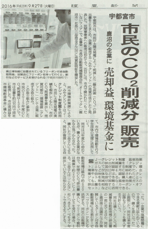この度、株式会社オートスナックは、宇都宮市の一般家庭の太陽光パネルによるCO2削減活動により創出されたJ-クレジットを活用し、地元の自動販売機(約400台)のCO2排出量をカーボンオフセットする取り組みを開始いたしました。 また、この自動販売機は、購入毎に地域の様々な店舗で使えるクーポン「フリーポン」が発券され、店頭で割引等に使用すると、使用者の1日分のCO2排出量6kgもカーボンオフセットされます。
