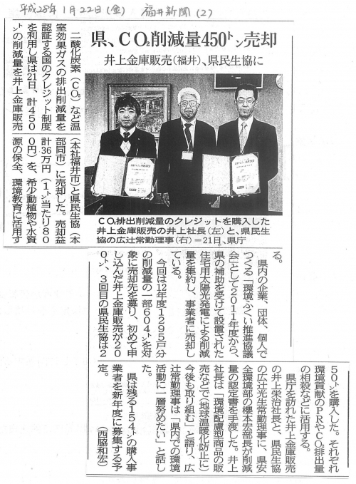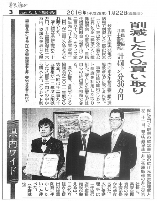 福井県 太陽光発電のクレジット売買実績(日刊県民福井・福井新聞 2016/1/22)