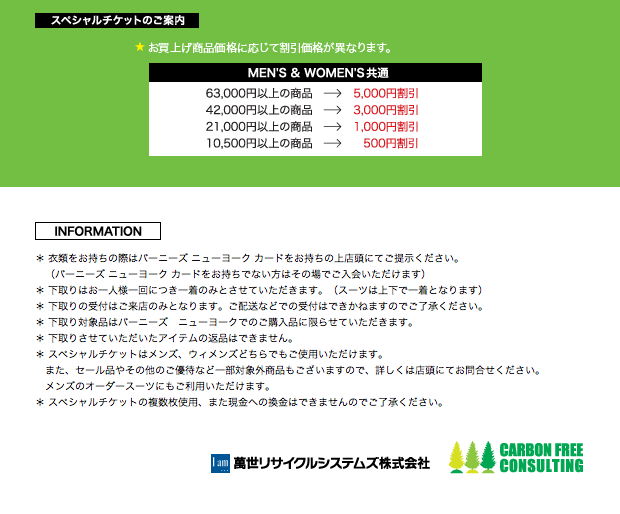 バーニーズ ニューヨークが取り組むリサイクルキャンペーン、「GO GREEN GO!」。2009年春からスタートし、お陰様でご好評いただいているこのキャンペーンも今回で5回目を迎えました。期間中、皆様のクローゼットに眠るご不要の衣類をバーニーズ ニューヨーク カードと一緒にバーニーズ ニューヨーク各店までお持ちいただくと、次回お買物の際にお使いいただけるスペシャルチケットと交換いたします。