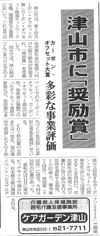 津山市 カーボンオフセット大賞「奨励賞」を受賞(津山朝日新聞 2015/12/5)