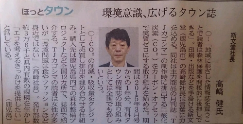 斯文堂様は、主力商品の月刊誌「TJカゴシマ」の製作時に排出するCO2を、カーボン・オフセットにより実質ゼロにする取り組みを開始されました。