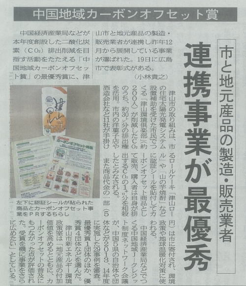 中国地域カーボンオフセット賞(山陽新聞 2015/2/18)