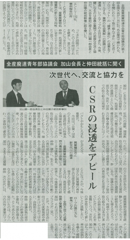 11月17日の週刊循環経済新聞にて、益社団法人全国産業廃棄物連合会の取組である「CSR2プロジェクト」が掲載されました。
