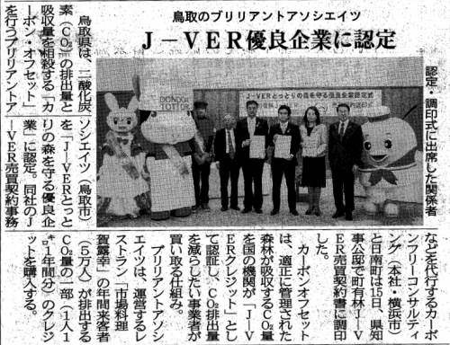 鳥取県鳥取市にて料理屋を経営するブリリアントアソシエイツ株式会社が、店舗の来店者へのカーボン・オフセット付与事業において、鳥取県日南町の森林整備により創出されたJ-VERを購入し、鳥取県より「J-VERとっとりの森を守る優良企業」に認定されました。