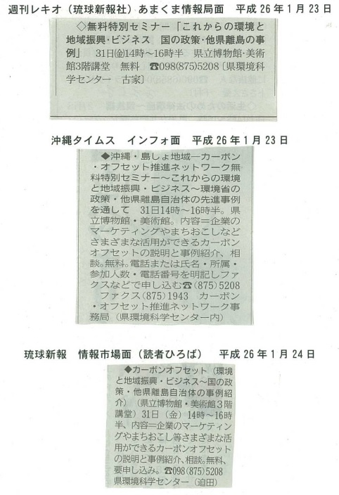 企業のマーケティングやまちおこし等に活用できるカーボンオフセット(週刊レキオ、沖縄タイムス、琉球新報20140123)