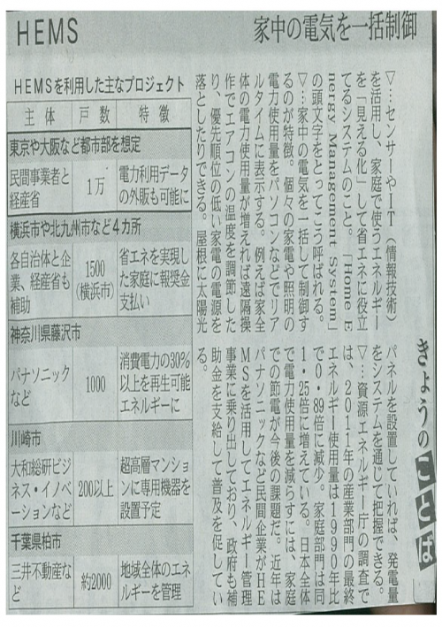 HEMS 家中の電気を一括抑制 (日本経済新聞 12.23)