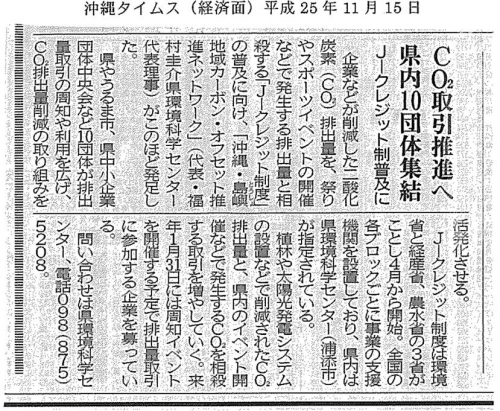 CO2取引推進へ県内10団体終結(沖縄タイムス1115)