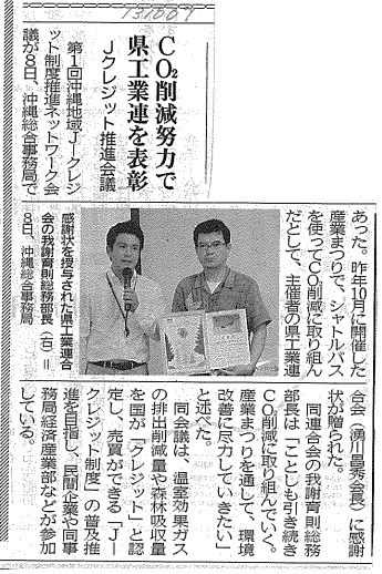 弊社がサポートさせて頂いた平成24年度10月実施の沖縄工業連合会主催・沖縄の産業祭りのカーボンオフセットが記事になりました。