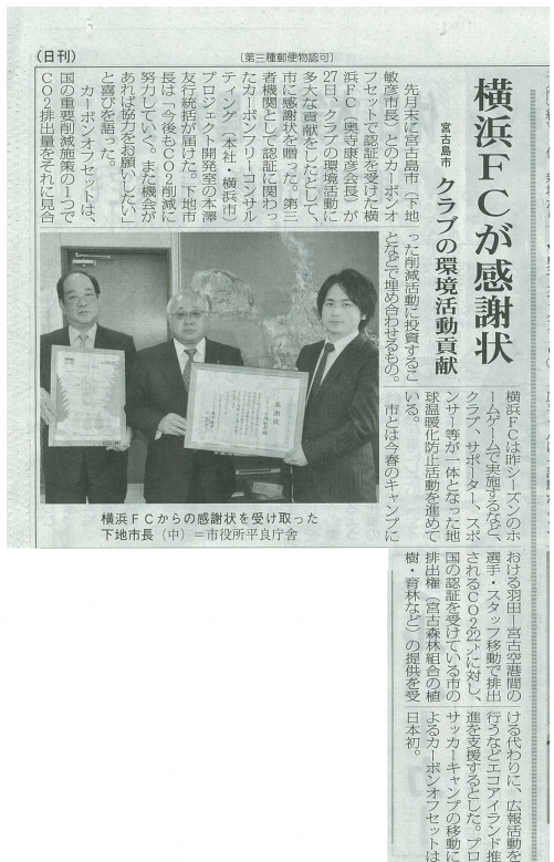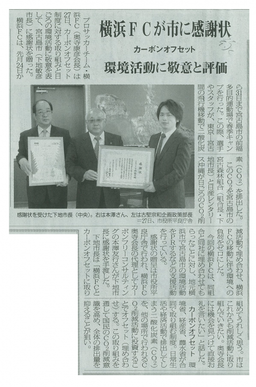 プロサッカーJ2の横浜FCは17日、カーボン・オフセット制度に対する取り組みと日頃の環境活動に敬意を表して宮古島市に感謝状を贈った。