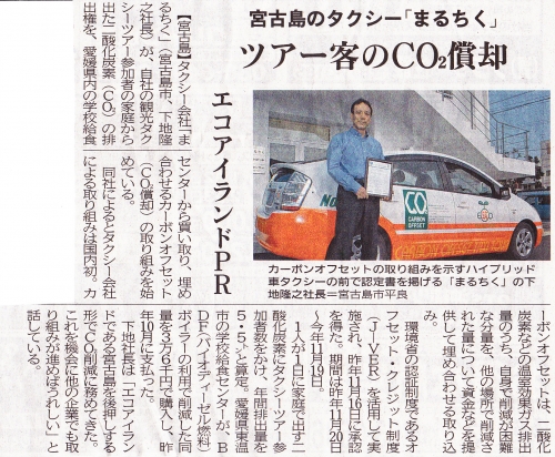 この度、弊社が株式会社まるちく様と共同で取り組ませていただいた、まるちくタクシーにおけるカーボン・オフセットが沖縄タイムスに掲載されましたので、ご紹介いたします。