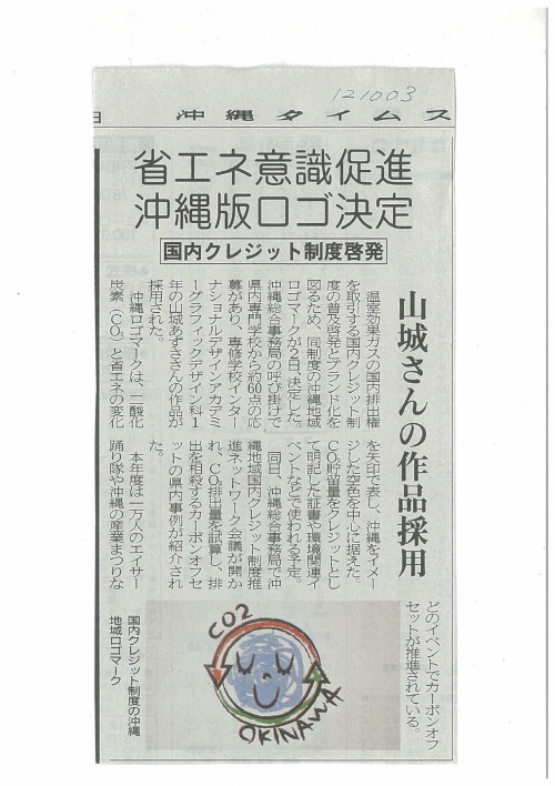 温室効果ガスの国内排出権を取引する国内クレジット制度の普及啓発とブラント化を図るため、同制度の沖縄地域ロゴマークが2日決定した。