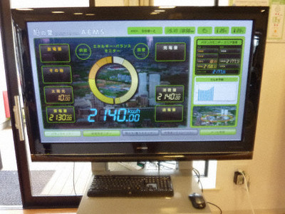 Photo taken May 17, 2012, shows a monitor set up in a community center at Kashiwa-no-ha campus city in Kashiwa, Chiba Prefecture, east of Tokyo, that shows real-time data on electricity consumption, power generated by solar panels and power supply from the local utility. The system adopted by the smart city is aimed at efficiently managing energy to power the community. (Kyodo)