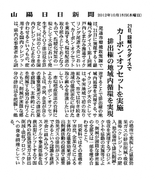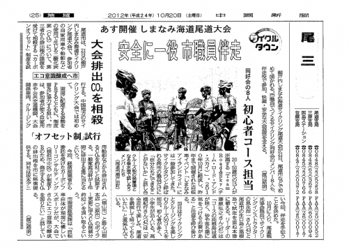 尾道市は、21日の瀬戸内しまなみ海道サイクリング尾道大会で、参加者の自家用車や船舶などの使用で 生じる二酸化炭素(CO2)について、第三者から排出権の譲渡を受けて相殺する「カーボンオフセット」制度 を試行する。中国地方のサイクリング大会では初めて。