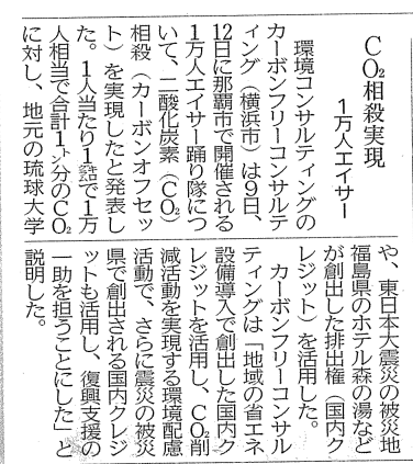 1万kgのカーボンオフセットの取り組みが琉球新報に掲載されましたのでご紹介いたします。