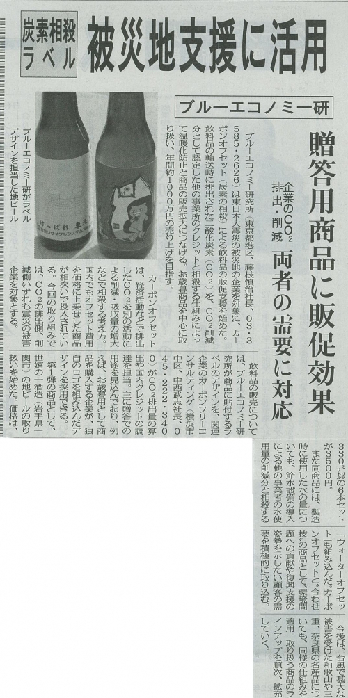 ブルーエコノミー研究所が実施する、カーボンオフセットによる飲料品の販促支援の取り組みが、日刊工業新聞に掲載されたので、ご報告いたします。