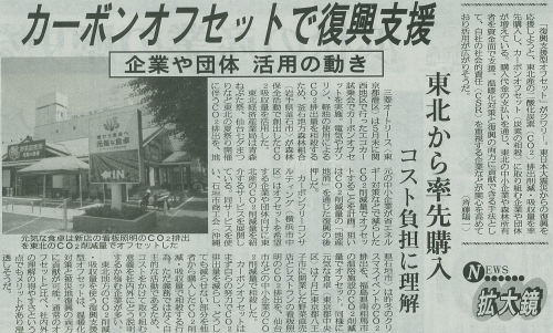 東日本大震災からの復興を応援しようと、東北地方の二酸化炭素排出削減・吸収量を率先購入し、カーボンオフセットに取り組む企業や団体の活動が、日刊工業新聞に取り上げられましたので、ご紹介いたします。
