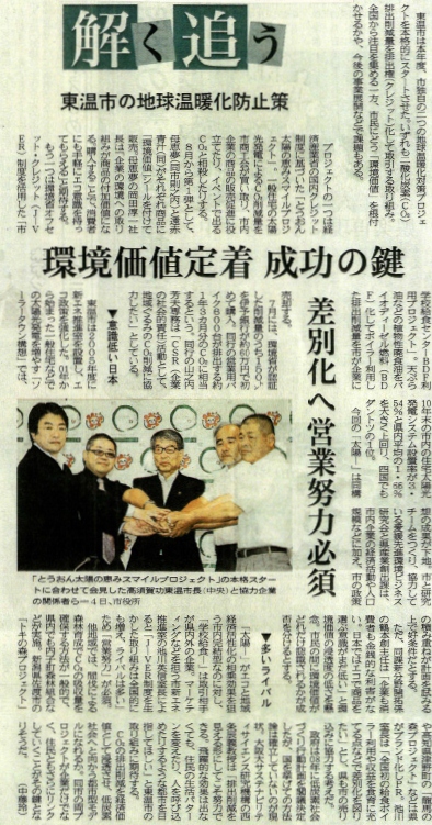 この度、愛媛県東温市ならびに東温市商工会が行う、「とうおん太陽の恵みスマイルプロジェクト」ならびに「市学校給食センターBDF活用プロジェクト」に関する記事が愛媛新聞に掲載されましたので、ご紹介いたします。