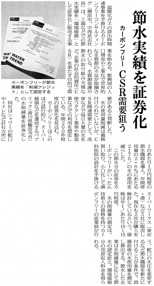 【新聞掲載】節水実績をクレジット化(2011年7月5日 日経産業新聞)
