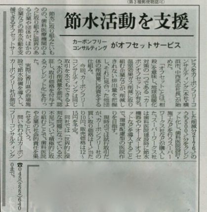 カーボンフリーコンサルティングが始めた、歯科医療機関のように節水の取り組みに限界のある企業や団体が、ほかの企業などの節水活動を支援できる、オフセットサービスが日本歯科新聞に取り上げられましたのでご紹介いたします。
