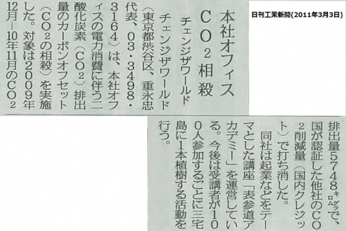 【新聞掲載】チェンジザワールド 本社オフィスCO2排出量をオフセット(日刊工業新聞)