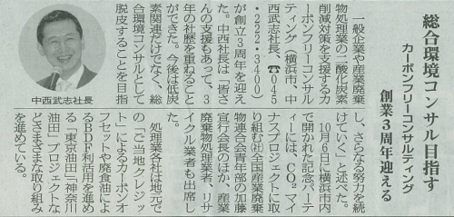 【新聞掲載】カーボンフリーコンサルティング 創立三周年(2010年10月18日 循環経済新聞)