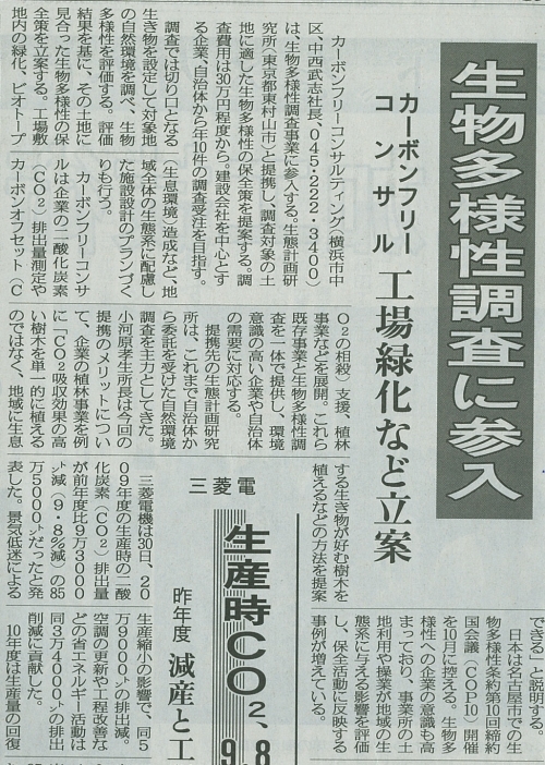 【新聞掲載】生物多様性調査に参入(2010年7月1日付 日刊工業新聞)
