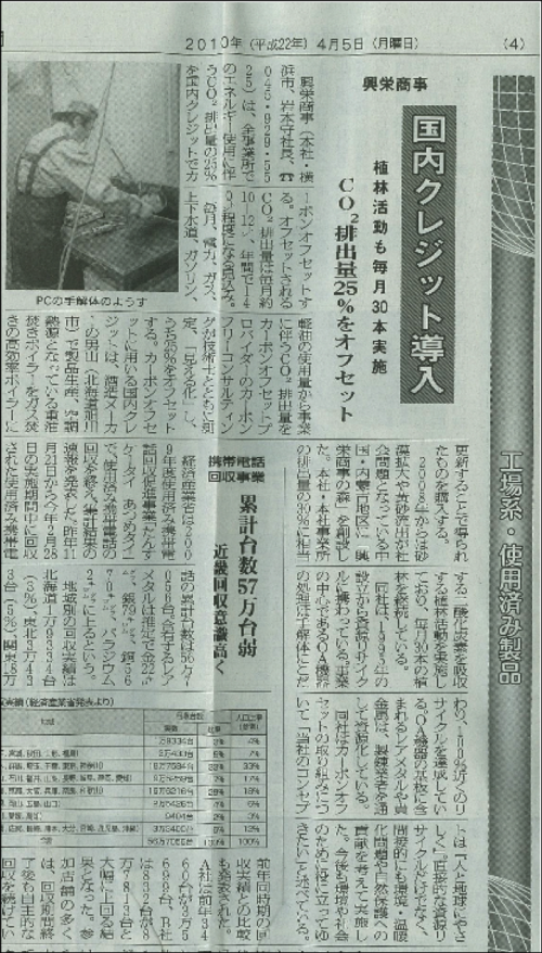 【新聞掲載】国内クレジットを用いてカーボンオフセット(4月5日付 循環経済新聞)