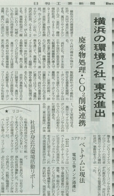日刊工業新聞に萬世リサイクルシステムズとカーボンフリーコンサルティングの東京でのビジネス展開について掲載されました。(4月30日付)