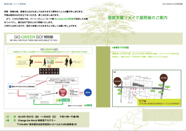 バーニーズニューヨーク様 Go Green Go 特別版で回収した古着 をリメイクし、展示会を下記のとおり開催いたします。 ご多忙とは存じますが、是非ご来場いただきますよう宜しくお願い申し上げます。