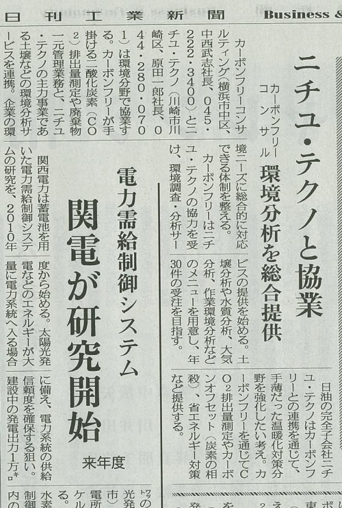 カーボンフリーは、ニチユ・テクノの協力のもと環境調査・分析サービスの提供を開始し、一方ニチユ・テクノは、カーボンフリーとの協力で温暖化対策分野を強化してまいります。