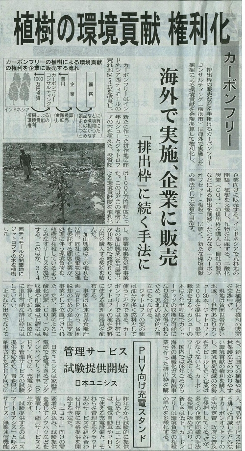本日(2010年1月12日付け)の日本経済産業新聞第二面に、弊社カーボンフリーコンサルティングと国連世界食糧計画(WFP)との共同事業に関して掲載されました。カーボンフリーコンサルティングはインドネシア西ティモールでの環境貢献・貧困撲滅事業を金額換算し、企業向けに販売を開始いたします。