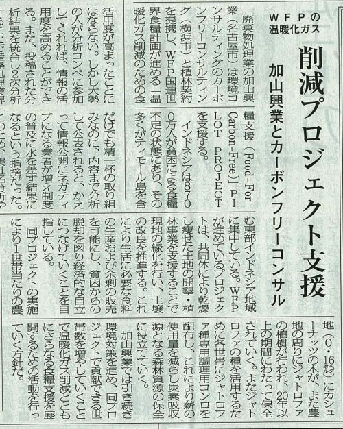 本日1月20日付の環境新聞に、WFP国連世界食糧計画が進める「温暖化ガス削減のための食糧支援(Food-For-Carbon-Free)」に関して掲載されました。廃棄物処理業の加山興業(名古屋市)はカーボンフリーコンサルティングと植林契約を提携し、本プロジェクトを通じて温暖化ガス削減と食糧支援を展開していきます。