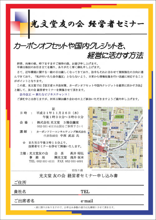 この度、光文堂では『改正省エネ法対策、カーボンオフセットや国内クレジットを経営に活かす方法』と題して、友の会経営者セミナーを開催させて頂きます。