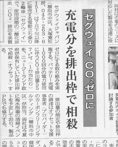 セグウェイジャパンが販売する電動立ち乗り2輪車「セグウェイ」で、使用段階のCO2排出を実質ゼロにする取り組みを、弊社カーボンフリーコンサルティングが担当し、実施致します。その取り組みが日刊工業新聞・日経産業新聞に掲載されましたので、ご覧ください。