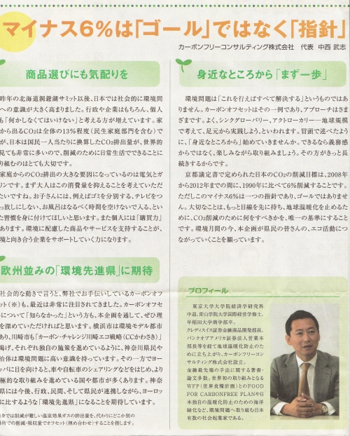 環境新聞は8ページで構成され、神奈川県知事、横浜・川崎市長のごあいさつ、各企業様の環境へのお取組みが紹介されています。2ページ目では、「地球温暖化防止 地域から」の特集で、弊社代表中西のインタビューも掲載されております。