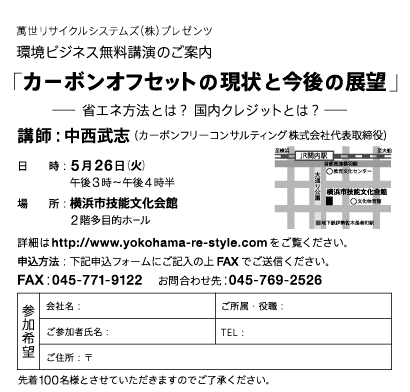 萬世リサイクルシステムズ株式会社はカーボンフリーコンサルティング株式会社代表取締役中西武志を講師として、カーボンオフセットの現状と今後の展望についての無料ビジネス講演を下記の通り開催することとなりました。