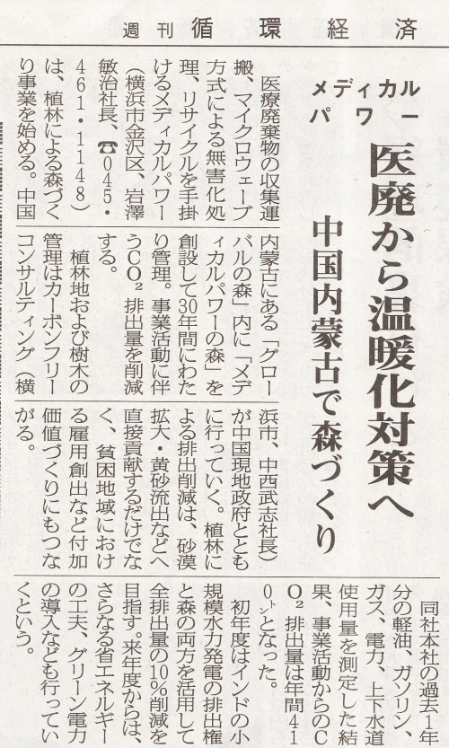 医療機器の廃棄物処理を行う、メディカルパワー社は植林事業による森づくりを始める。この事業では内蒙古に「メディカルパワーの森」の創設、30年 に渡っての管理を通じて、事業活動に伴うCO2排出削減を行う。植林地及び樹木の管理は中国現地政府と弊社によって進められる。