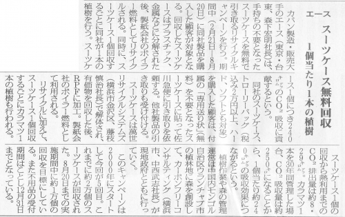 カバン製造・販売大手のエース株式会社 (代表取締役社長 森下宏明/東京都台東区/旅行バック、スーツケース、ビジネスバック、スポーツバック、ファッションバッグなどの製造、卸)は、不要になったスーツケースを無料で引き取るリサイクルキャンペーンを行う。回収したスーツケースは分解された後、燃料としてリサイクルされると同時に、スーツケース1個回収するごとにカラマツが1本植林される。