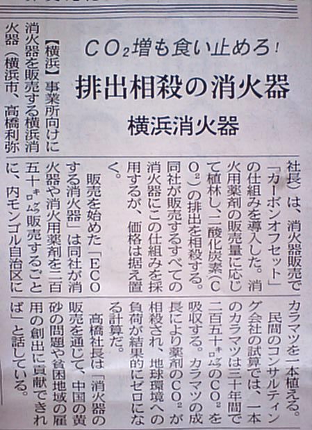 事業者向けに消火器を販売する横浜消火器は消火用薬剤の販売量に応じて植林し、その分の二酸化炭素を吸収し、地球環境に貢献する仕組みの消火器、「ECOする消火器」を発売した。高橋社長は「消火器の販売を通して、中国の黄砂問題や貧困地域の雇用の創出に貢献できれば」と語っている。
