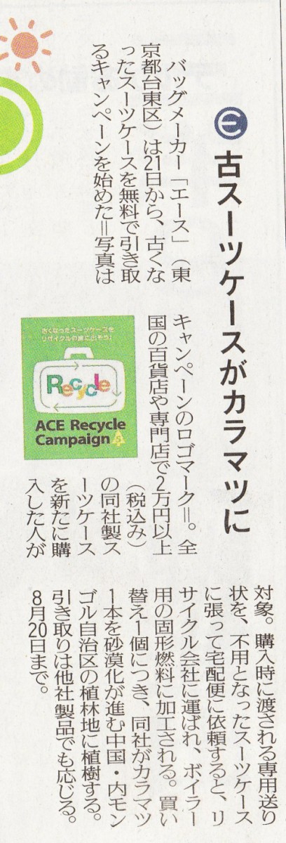 カバン製造・販売大手のエース株式会社 (代表取締役社長 森下宏明/東京都台東区/旅行バック、スーツケース、ビジネスバック、スポーツバック、ファッションバッグなどの製造、卸)は、不要になったスーツケースを無料で引き取るリサイクルキャンペーンを行 。回収したスーツケースは分解された後、燃料としてリサイクルされると同時に、スーツケース1個回収するごとにカラマツが1本植林される。