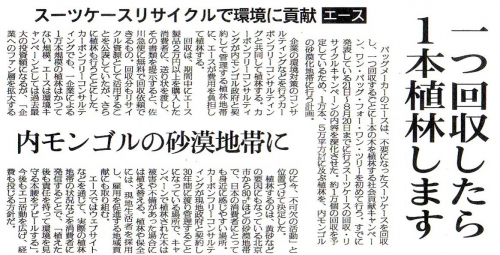 エース株式会社は中国内蒙古自治区の植林地にACEの森を創設しました。エース株式会社では、使用済みのスーツケースの回収に協力してくださった方全員にスーツケース一つにつき一本の植林をいたします。
