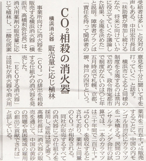 事業者向けに消火器を販売する横浜消火器は消火用薬剤の販売量に応じて植林し、その分の二酸化炭素を吸収し、地球環境に貢献する仕組みの消火器、「ECOする消火器」を発売した。