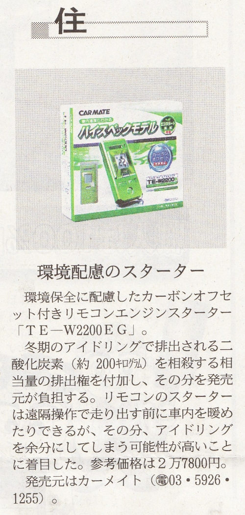 株式会社カーメイトが発売した環境保全に配慮したカーボンオフセット付きリモコンエンジンスターター「TE-W2200EG」が2008年10月6日日経MJ紙の新製品ページで紹介されました。